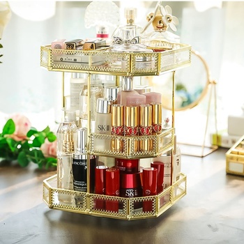 सोने श्रृंगार प्रदर्शन रैक इत्र सौंदर्य प्रसाधन भंडारण बॉक्स ग्लास पारदर्शी बारी बारी से डेस्कटॉप कैबिनेट धातु मेकअप पकड़